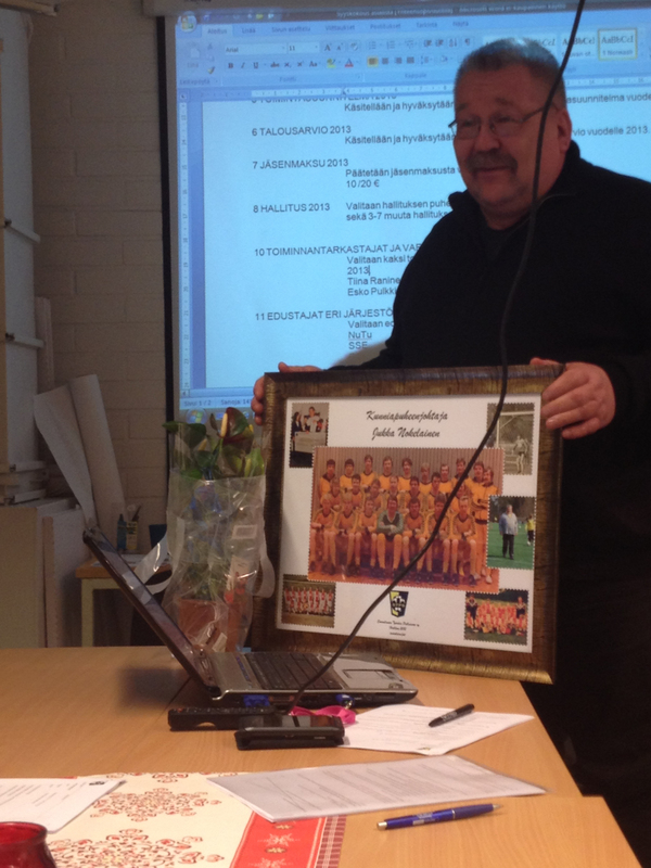 Julle vastaanotti kukat ja taulun, johon oli kerätty kuvina muistoja pelaajauralta,valmennusuralta sekä saavutuksista puheenjohtaja ollessaan, mm. FAIR PLAY palkinto ja Suomen 1. Jalkapallon Nuori Suomi Sinettiseura sekä Kesämaa-areena.